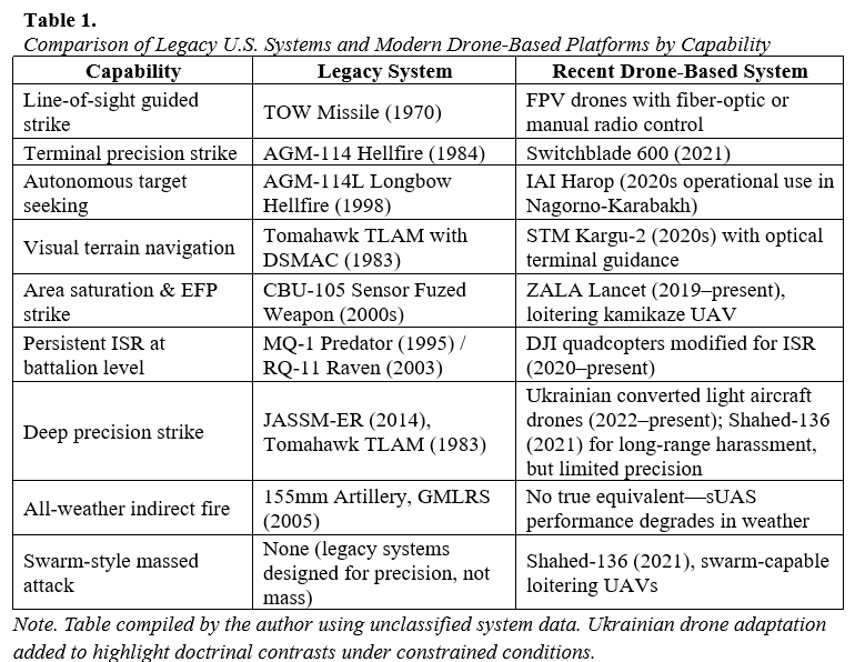 The implication is not that sUAS have no value, but rather that their marginal utility must be measured against what already exists. When precision, survivability, integration, and strategic scalability are required, the United States already possesses the capabilities that sUAS are now being credited with inventing.
